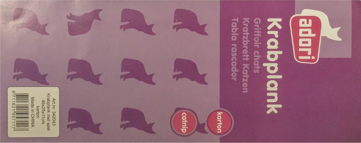 Je kent natuurlijk de krabpalen van sisaltouw, maar er zijn ook kartonnen krabpalen die je kat kan gebruiken voor het onderhoud van zijn nagels. Sommige katten krabben zelfs liever horizontaal dan verticaal. De Adori Krabplank Met Spel is zo’n krabplank. Dit is een kartonnen krabplank met aan het uiteinde een gleuf met een balletje erin. Dit balletje kan je kat er niet (makkelijk) uit krijgen, wat zorgt voor uren speelplezier. Aan de zijkanten vind je een leuk motief van kattenhoofdjes- en pootjes.