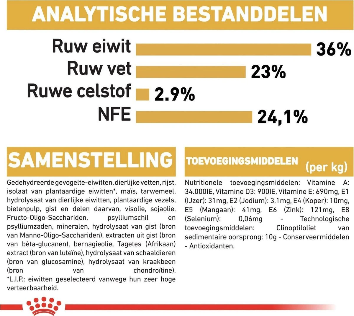 | Voedingswaarde | Samensteling: gedehydreerde gevogelte-eiwitten, rijst, dierlijke vetten, isolaat van plantaardige eiwitten*, maïs, hydrolysaat van dierlijke eiwitten, plantaardige vezels, bietenpulp, visolie, mineralen, sojaolie, Fructo-Oligo-Sacchariden, psylliumschil en psylliumzaden, hydrolysaat van gist (bron van Manno-Oligo-Sacchariden), bernagieolie, tagetes (Afrikaan) extract (bron van luteïne), hydrolysaat van schaaldieren (bron van glucosamine), hydrolysaat van kraakbeen (bron van chondroïtine) |